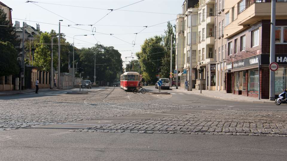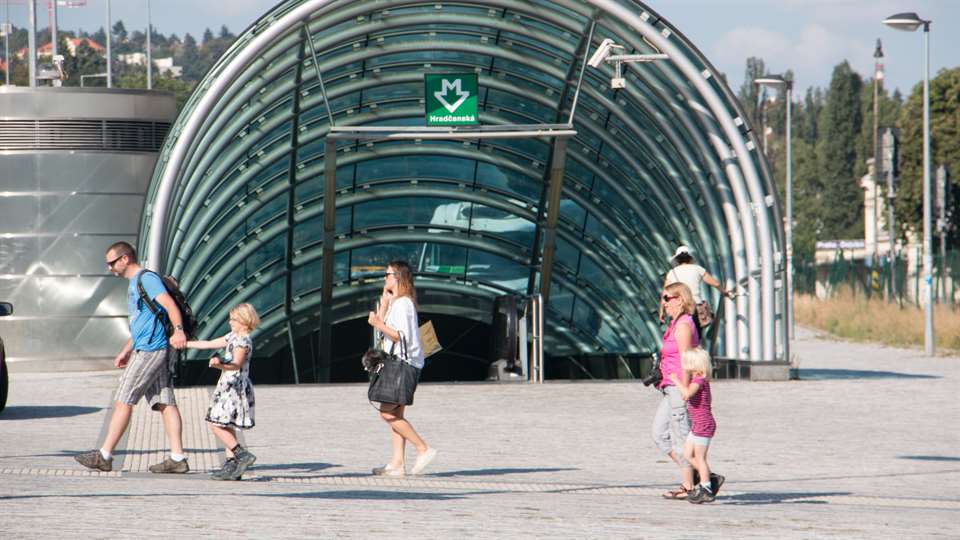 Metro A – stanice Hradčanská (cca 200 m) Tram č. 1, 2, 5, 8, 18, 20, 25, 26, 51, 56, 57 – zastávka Hradčanská (cca 200 m)